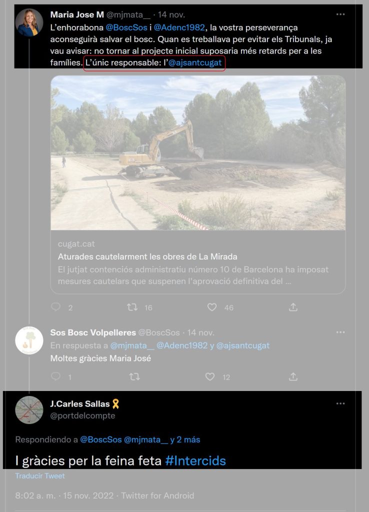 Doncs bé, com dèiem, els veïns i veïnes que no volien la ingerència que suposa l’actual projecte de l’escola pública La Mirada al parc equipat del bosc de Volpelleres, agafaven força en forma d’assessorament jurídic i polític de la mà de persones que saben com funciona la política i que han governat molts anys la ciutat, no només coneixen molt bé les persones que treballen a l’ajuntament, sinó que de fet hi treballaven. Amb tot aquest suport van avivar el conflicte social per tal de defensar els seus interessos personals i polítics.